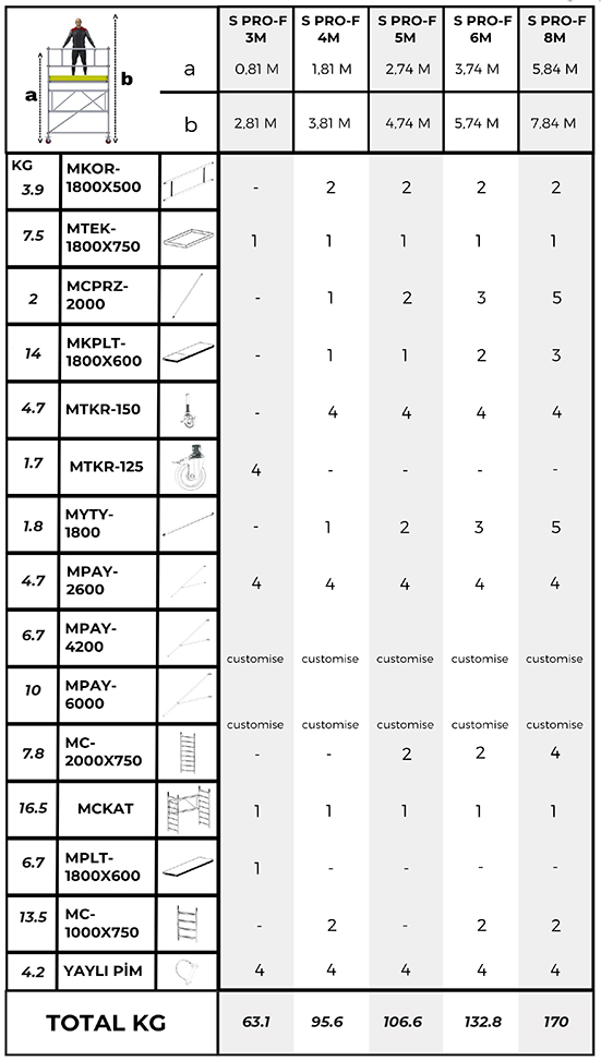 S Pro mobile scaffold systems are lightweight, durable, and modular access solutions developed for professional users. Thanks to their aluminium frame structure, they are easy to transport and quick to assemble, while also providing a safe working area with high load capacity. Their modular design adapts to different height options, offering a wide range of use in construction, maintenance-repair, industrial facilities, and indoor applications.