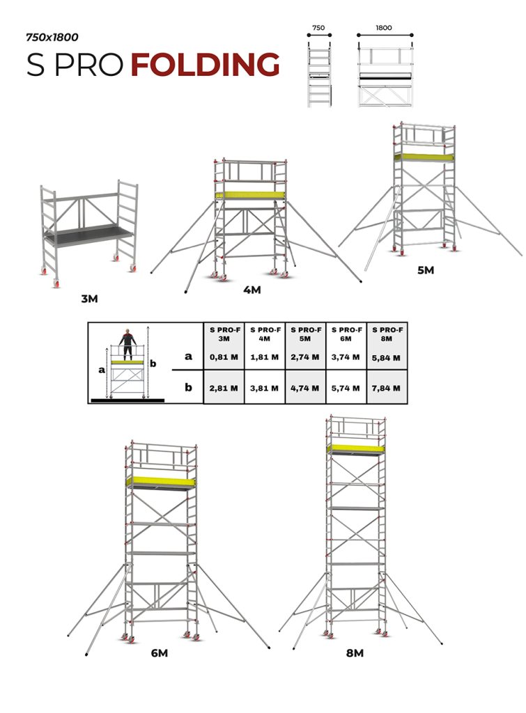 S Pro Folding is an ultra-compact mobile scaffold system developed for very narrow and restricted working areas, featuring a 1200×750 mm platform. It offers working height options between 4–8 metres, providing high functionality for applications such as maintenance, electrical, and mechanical installation. Despite its small size, it is suitable for professional use with its TÜV and TSE certified structure that ensures full safety.
