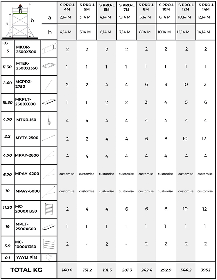 S Pro Large provides maximum access in large-scale projects with its wide-surface platform (2500×1350 mm) and high-durability aluminium frame. Working height options ranging from 4 to 14 metres allow easy adaptation to different application needs thanks to its modular assembly structure. It offers safe mobility both indoors and outdoors with its wheeled and outrigger design. The TSE and TÜV certified system meets safety standards at the highest level.