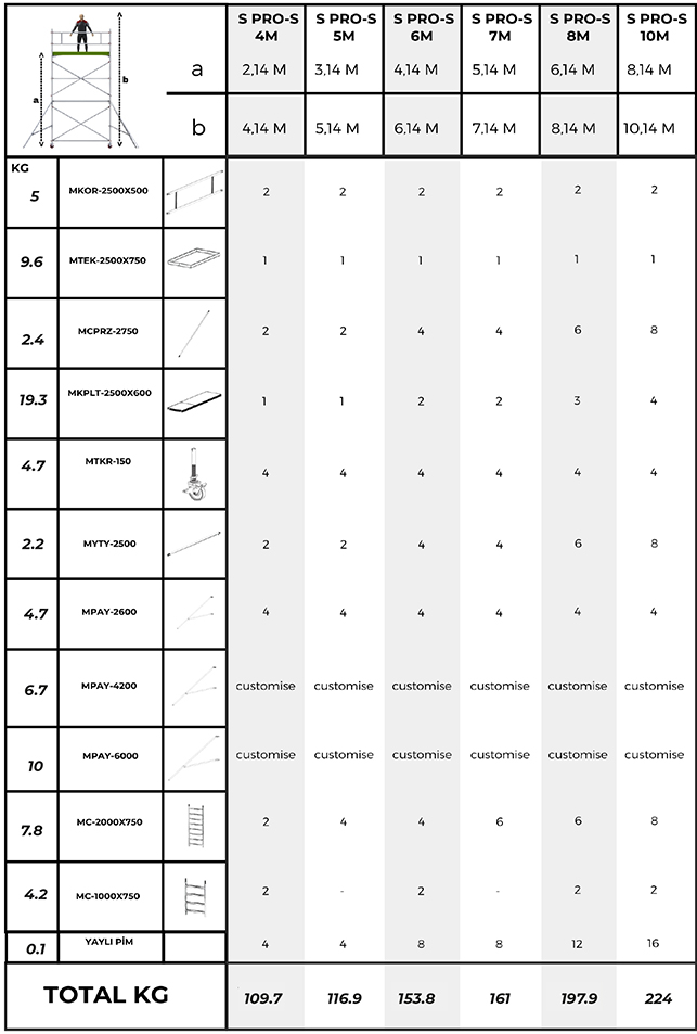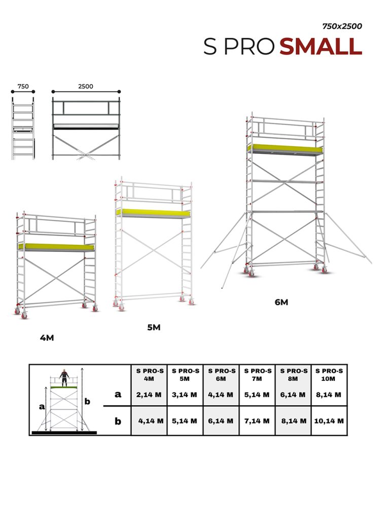 S Pro Small is a narrow-area compatible mobile scaffold offering compact working capability at heights between 4–10 metres.